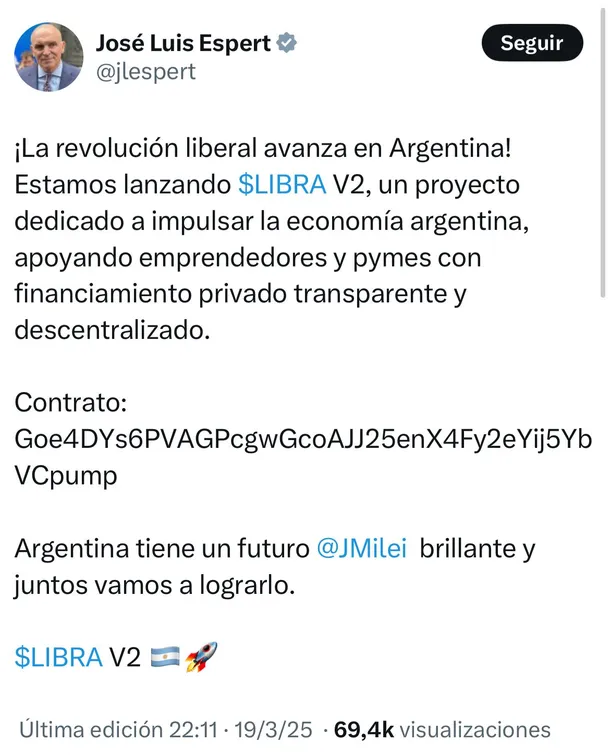 El diputado nacional José Luis Espert generó una fuerte polémica este miércoles por la noche al publicar en sus redes sociales un mensaje promocionando la criptomoneda $Libra V2, una nueva memecoin que desató sorpresa y controversia entre sus seguidores.